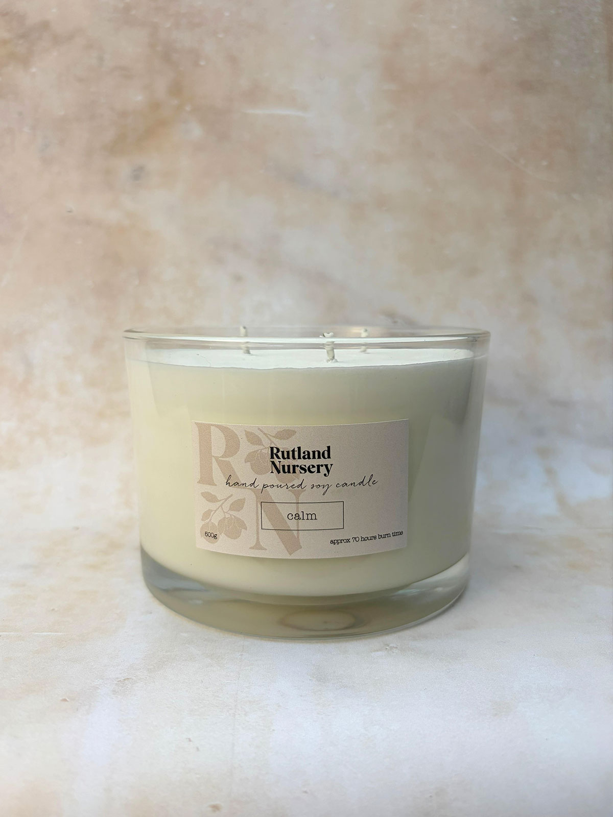 Calm Large 3 Wick Candle by Rutland Nursery, this beautiful hand poured soy wax candle is created especially for us.